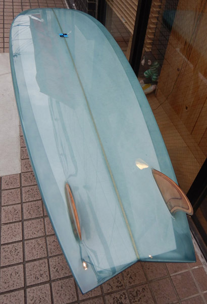 グレイブルーのティントカラーでラミネートしたブギーが入荷しました。レングスは6’0。幅も厚みもたっぷりで浮力たっぷりのツインフィンです。