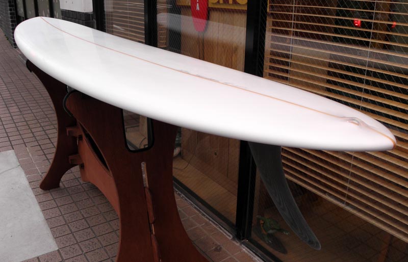 とてもきれいな流線形を描くアウトライン。9フィートの長さでシェイプしたプリモです。昨日のブギーはお店のストックボードでしたが、これは私のパーソナルボードとして作ってもらったものです。