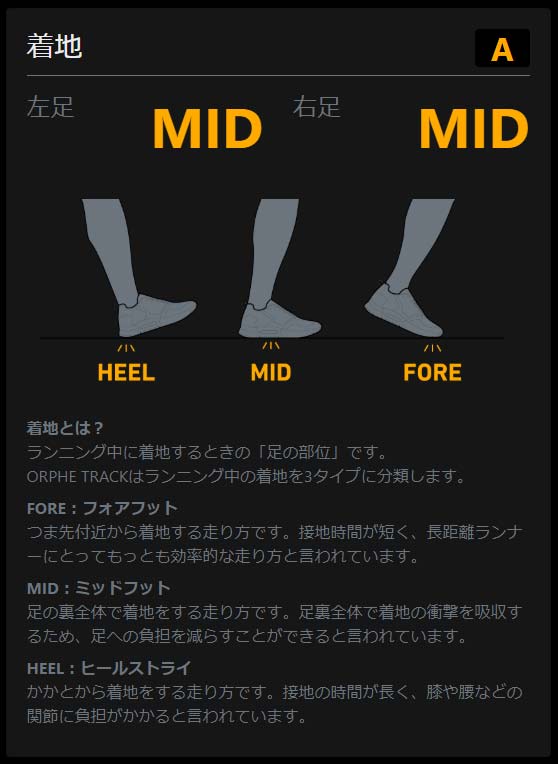 昨年の秋に自分のフォームを解析してもらったときのデータです。きれいにミッドストライクで着地しているそうです。A判定でした。