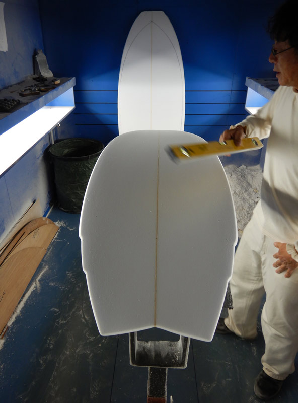 シェイプルームでは、活さん今年最後のシェイプです。Iさんご依頼の5’8”BONITAです。ご依頼どおり、例の赤いBONITAと同じようにシェイプしました。