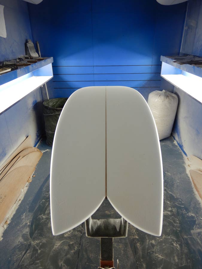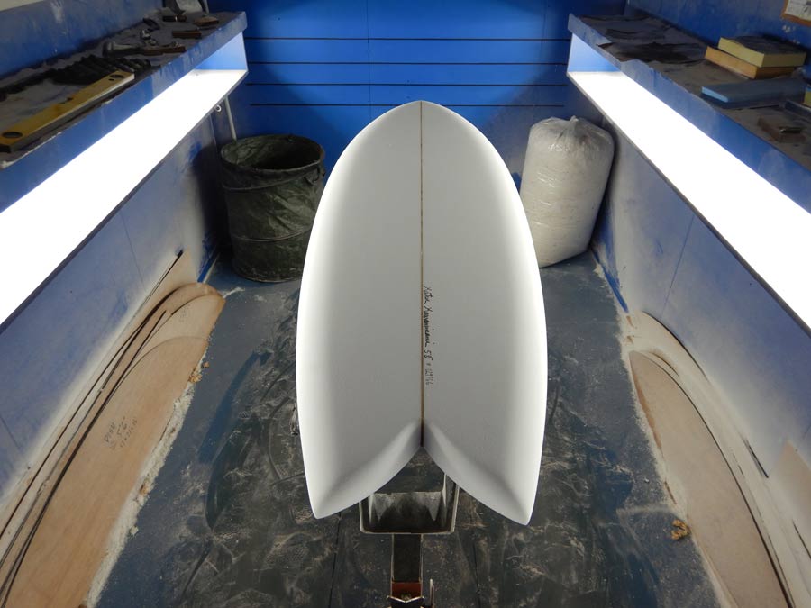 フィンは小さなフィッシュと同じで、三角形のキールフィンでダブルフォイルです。シングルフィンと同じようにボトムに対して垂直に、そしてストリンガーと並行にグラスオンしているのがポイントです。