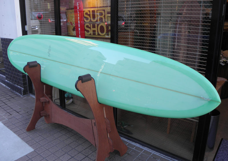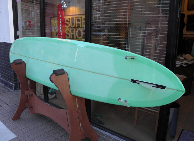 9’2”。ロングボードサイズのTIKIが出来上がりました。カスタムオーダーです。ミントグリーンのティントカラーでラミネートしました。ヴィンテージカーっぽいカラーはウディワゴンみたいで、きれいなカラーに仕上がりました。