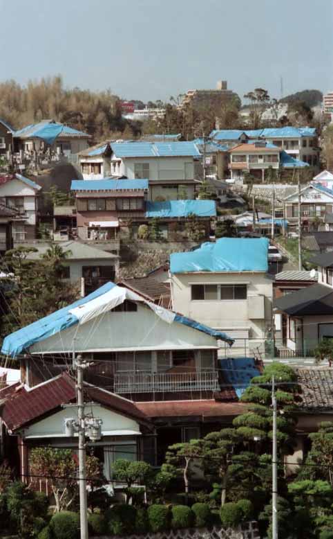 実家があった長崎も大きな被害を受けました。兄の家は屋根が吹き飛びました。バリバリと屋根が剥がされていく音に生きた心地がしなかったそうです。実家も屋根瓦が飛んで雨漏りの跡が残っています。鉄の雨戸には細長いスリット状の穴がいくつも開いているのは、飛んできた屋根瓦が突き刺さったあとです。そんなものが人に当たれば命に関わります。強風に飛ばされた海水の塩分が原因で山の緑は枯れ、台風の後はブルーシートが張られたたくさんの屋根と茶色い山が街の色でした。