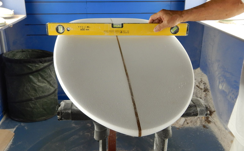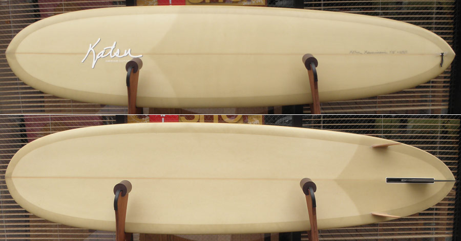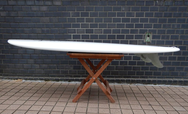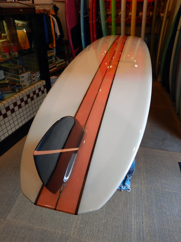 レングスは、5’8”くらいから6’0プラスくらいで作っています。フィンは上のシングルスタビの他、シングル、トライ、ツインスタビ、クアッド、ボンザーとMINIと同じで、いろんなセッティングが可能です。全部、作ったことがあると思います。私は5’8”のツインスタビでした。