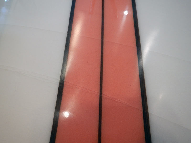 3本ストリンガーとボランラミネートで重量はしっかりとあります。このテールエッジとVEEとロッカーの組み合わせ(それにカットDフィン)で動きは良いそうですが、あえて重量を持たせたままなのは、やっぱり基本的にはクラシックということなのだと思います。