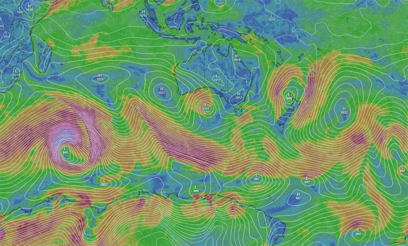 何やらすごいタイトルですが、湘南へうねりを届けてくれそうな低気圧(台風)の動きをチェックしていて、何気なくダウンアンダーへ画面をドラッグしてびっくり。真っ赤ですごい等圧線です。