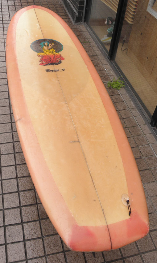 以前、所有していたこのハーバーのVEEボトムのヴィンテージボード。これをシェイプしたのも、マーク・マーティンソンです。(上の動画でも、ハーバーの赤いVEEボトムに乗ってますね)