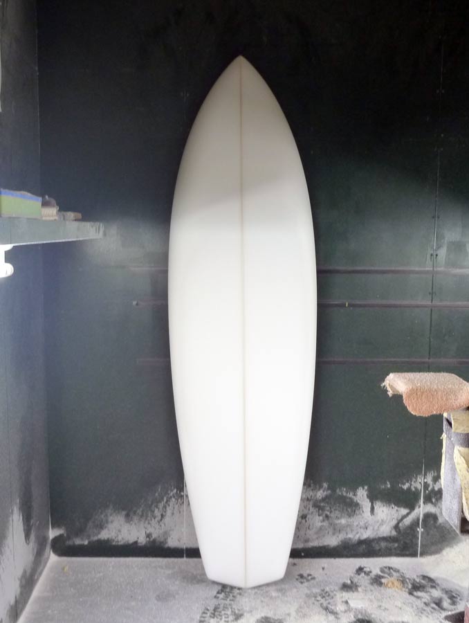 私の考えで、テールのフラットな部分だけに浅くコンケーブを入れてもらおうと思っていましたが、そうするとスピードのラインがキープできないということで取りやめ。テールはフラットになります。