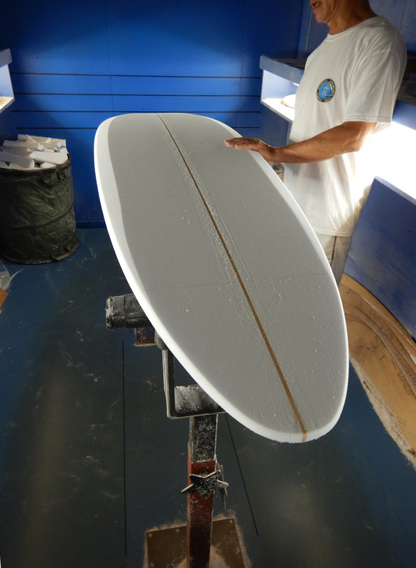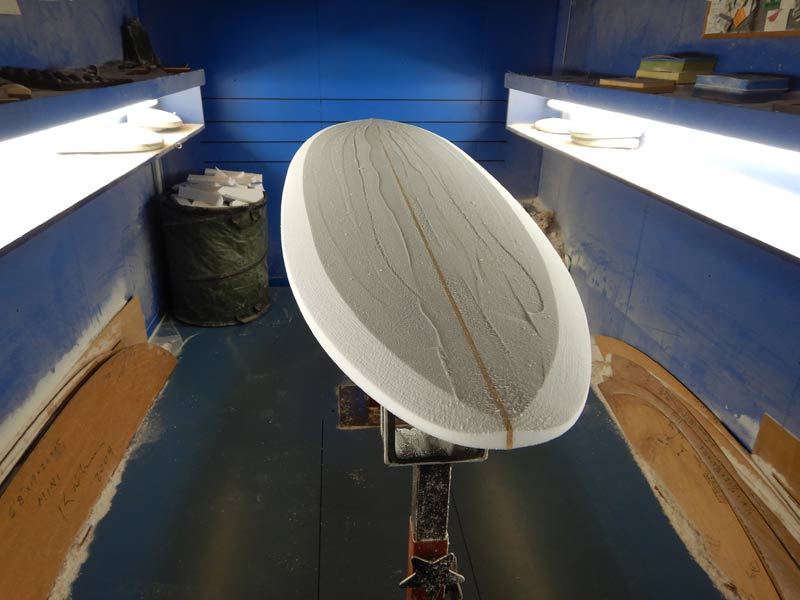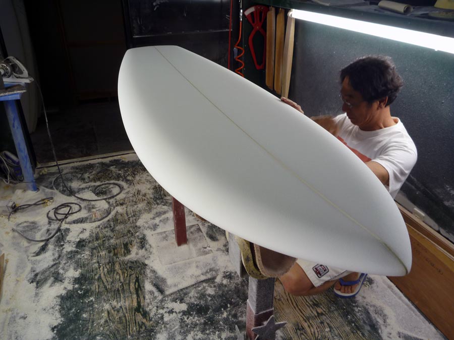 そのラインへ周囲の曲面を集束させるように周りの形を整えていきます。15年以上、活さんのシェイプを見学させてもらっていますが、まずはスピードが出るライン(ロッカー)をという考え方は昔から同じで変わらない部分です。