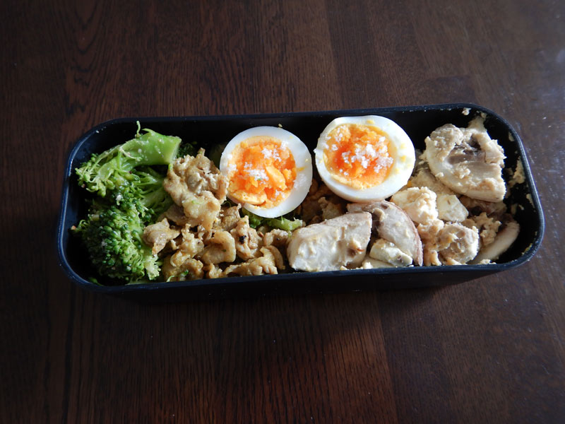 パルメジャーノチーズとクミンで味付けした、蒸したブロッコリー、豚肉のインド風スパイス炒め、ゆで卵、マッシュルームのフムスとチーズ和えです。