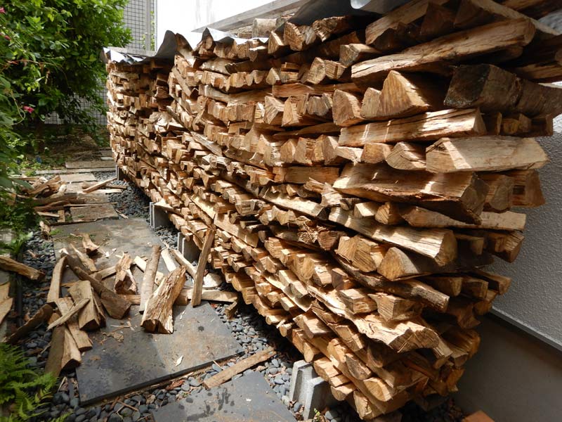 風通しが良いように井桁に積みあげて、2~3年乾かすと燃やせる薪になります。結構しっかりとしていて、多少のことでは崩れません。