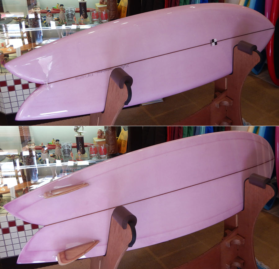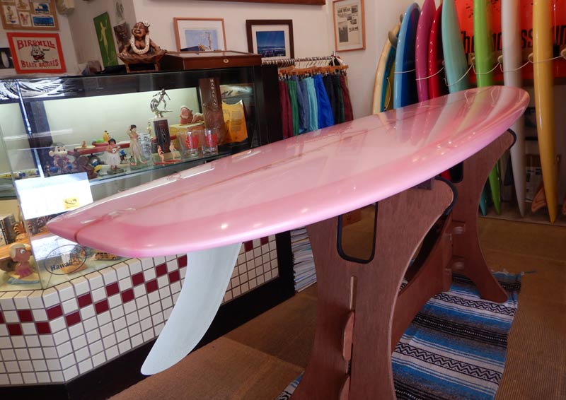 BONITAは2本です。まずは、5’10”。ライトバーガンディティント、思っていた以上にきれいに仕上がりました。今思い出しましたが、クリステンソンサーフボードのポイティントという色にもよく似ています。「ポイ」というのはハワイの酸っぱくて美味しいアレです。
