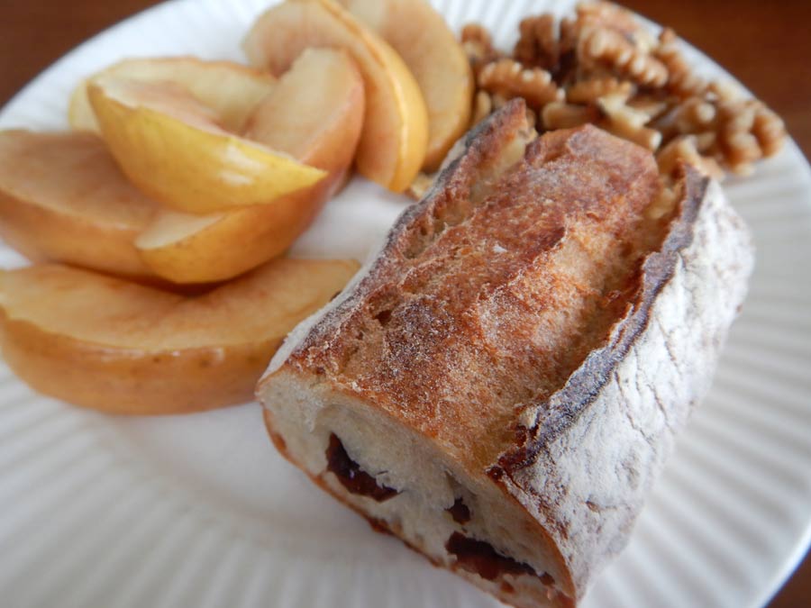 あんこバターサンドとリンゴとくるみ。これにヨーグルトとコーヒー。あんこバターサンドは特別ですが、いつもは焼き芋。