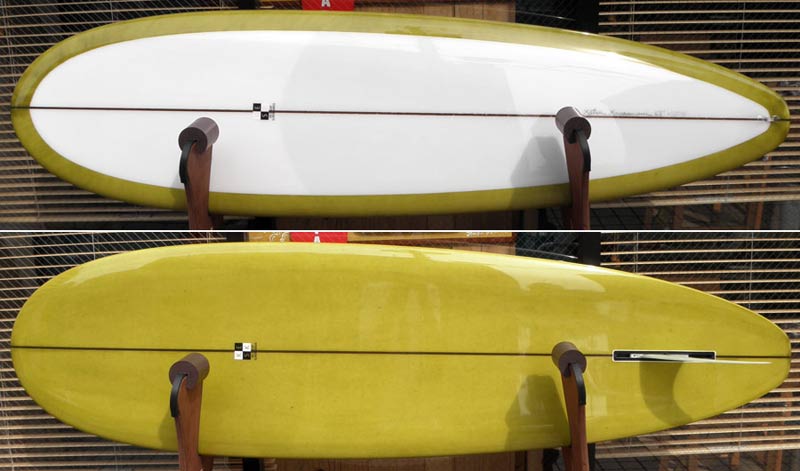 それは、それまで乗っていたクラシックなログとはまったく違う操作法で、いったん波を滑り始めるとそれまで味わったことがない感触が伝わってきました。不思議なボードだと分からないながら乗っていて、たまたま見たマリブのシェイパーのシングルフィンが同じようなボトム、そしてレールの形状をしていたのに興味を持ちました。