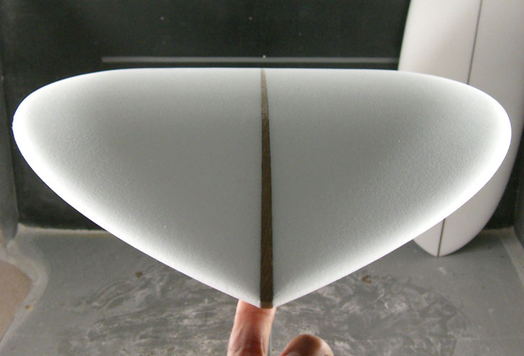 そしてもう一本はシングルフィン。お待ちかね、6’8”のスタビー、出来上がりました。シェイプの模様は過去ブログをご覧ください。