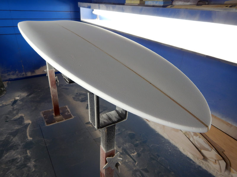 シェイプができあがったプリモのボトム。レングスは6’11”。ボトムとレールのかたちが良くわかります。レール近くの丸く盛り上がっているところが元のロッカー。それよりもフラットなラインをセンターのコンケーブによって作り出し、そのままテールへスムースに抜けていきます。