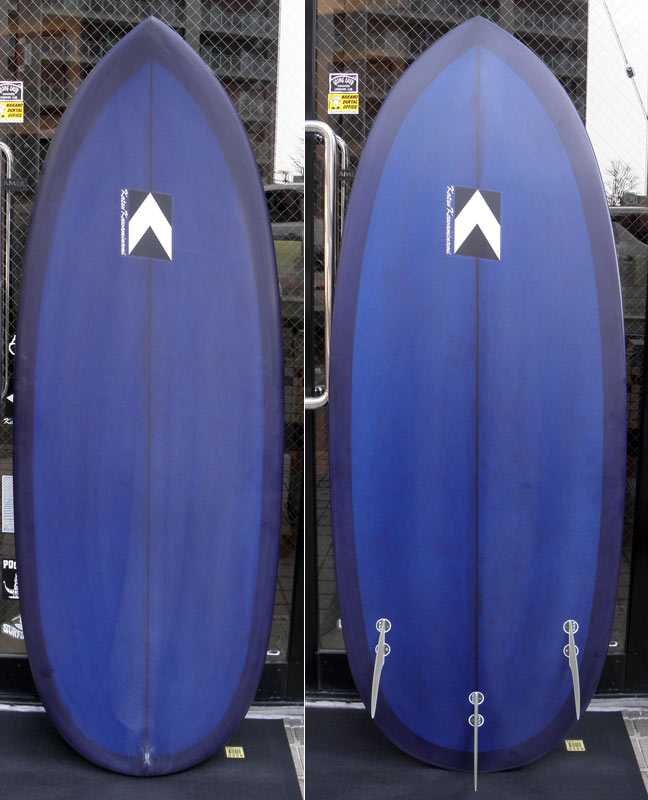 それからもう一本はニーボード。川南正さんのシェイプです。ネイビーのティントで、仕上げはつや消し、ウェットサンディング仕上げです。仕上げでも雰囲気変わります。