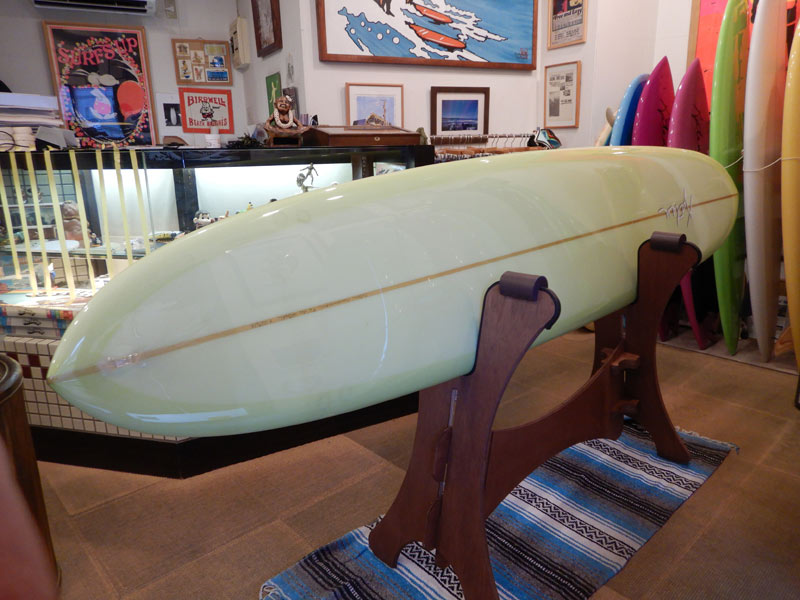 これは、9’6”。ノーズコンケーブを入れた、トライプレーンのボトムとはちょっと違うTIKIです。ラウンドピンテールノーズライダーのTIKIです。動きはやっぱりスムースです。