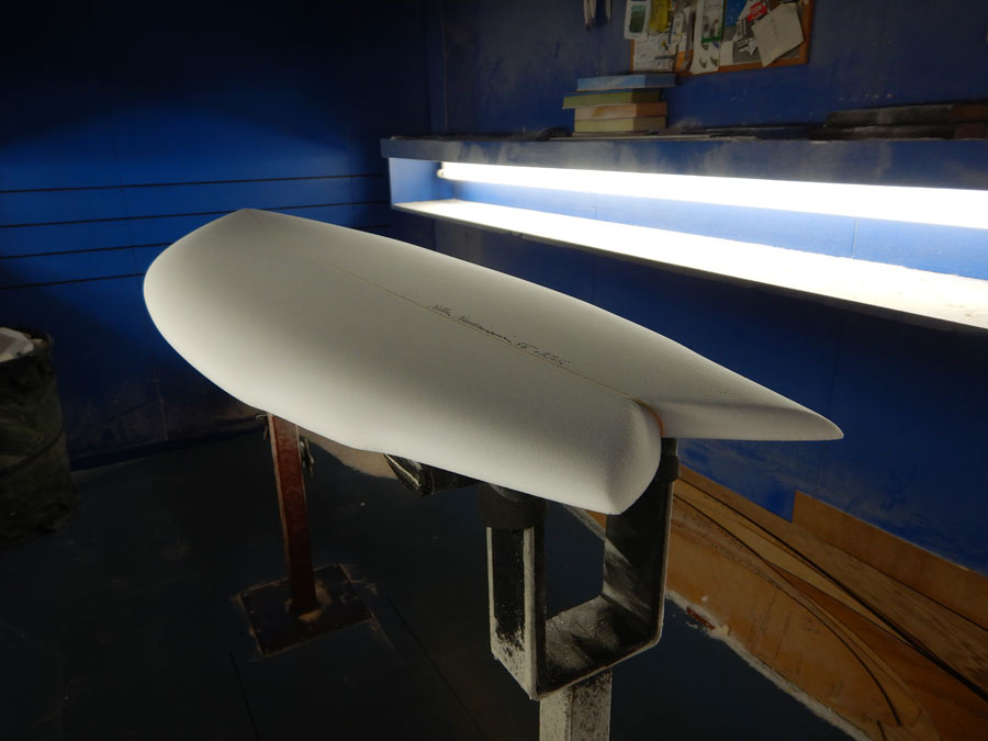 6'8"のフィッシュのシェイプが出来上がりました。グラスショップへ旅立つ直前のところをつかまえて写真を撮ってきました。いい形でしょ?