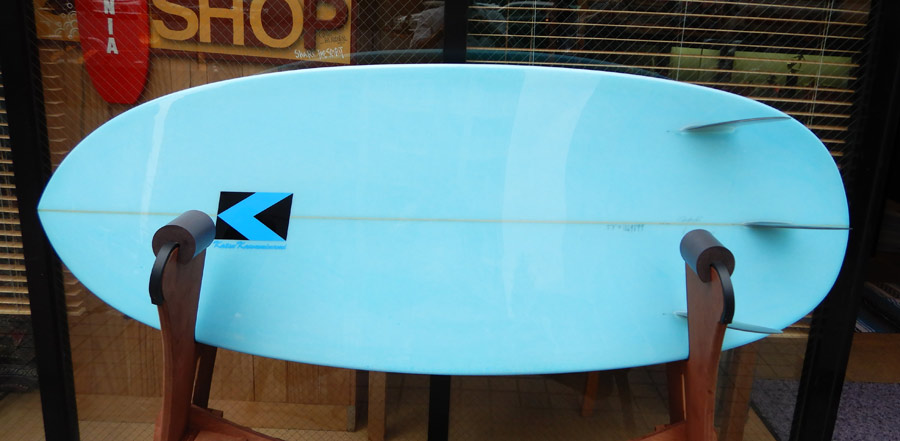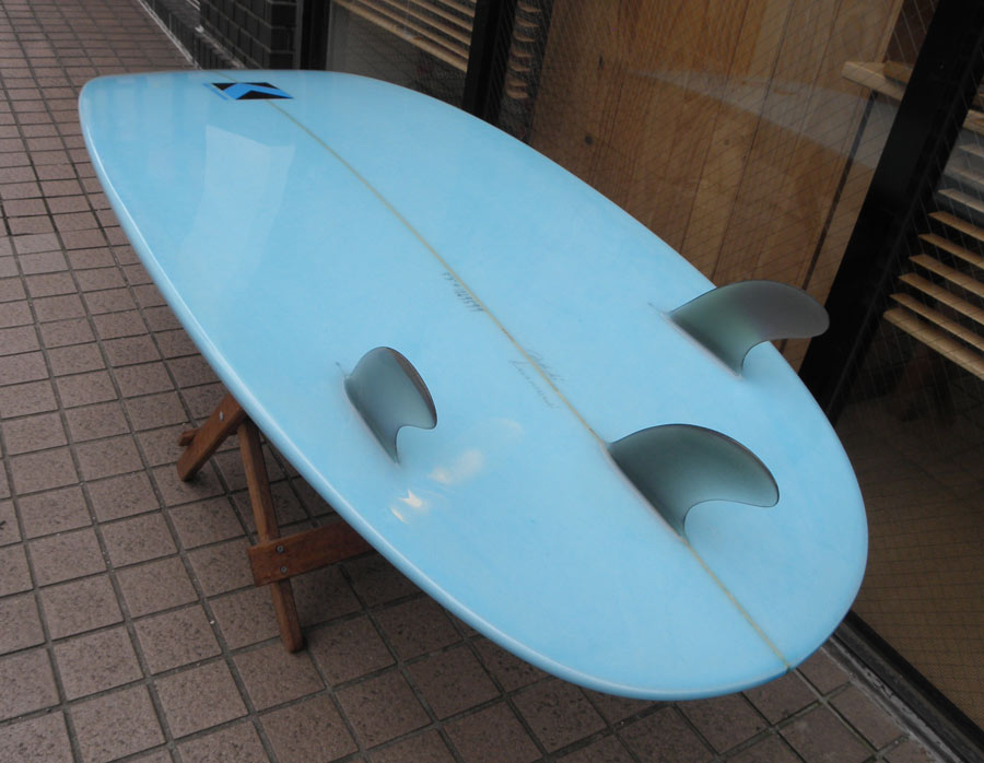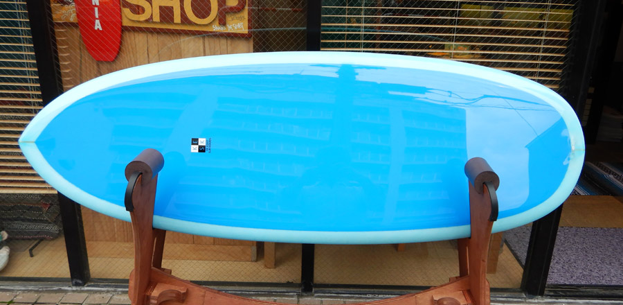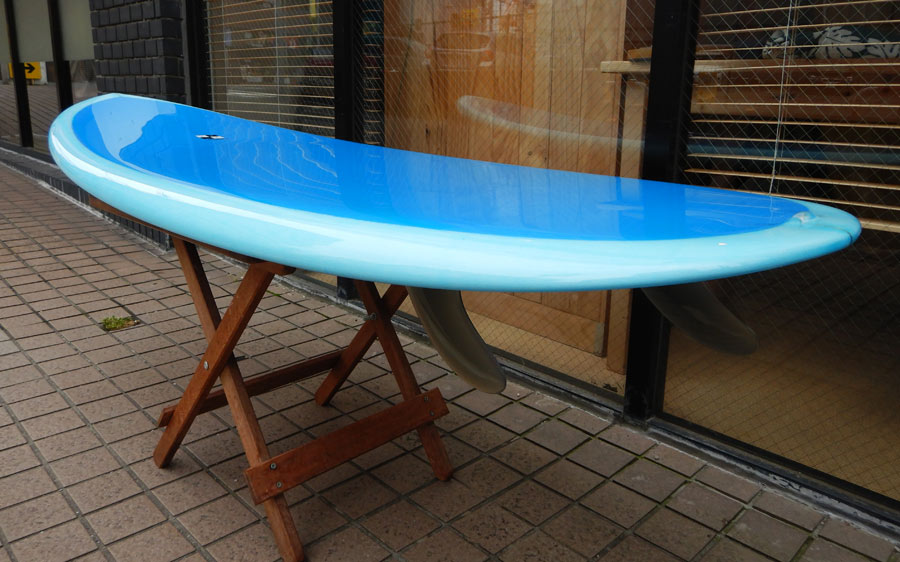 小さい方も出来上がりました。5’6”です。これはお店のストックボードなので、すぐ乗りたい方、お持ち帰りOKです。スティールブルーをイメージしたティントカラーできれに仕上がってます。フィンはダブルフォイルです。