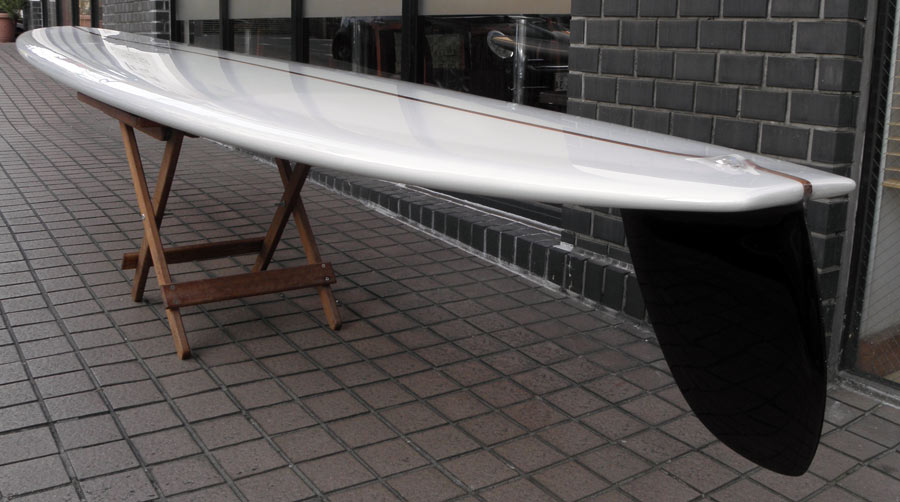 9’9”のPIG。高密度発泡のフォームにレッドシダーのストリンガー、8オンスのボランクロスでラミネートして、Dフィンをグラスオンしたクラシックボードです。