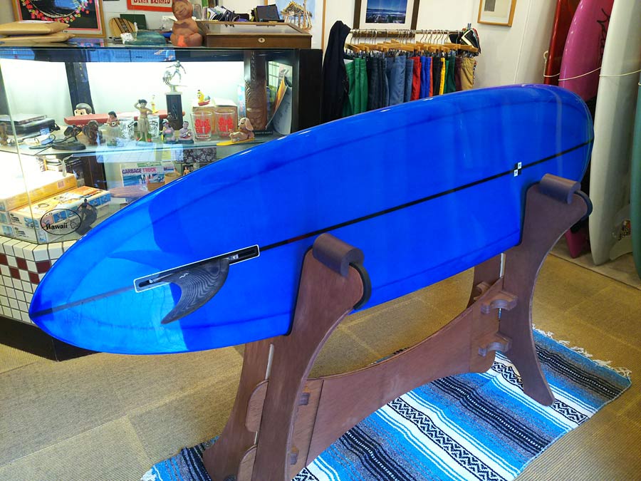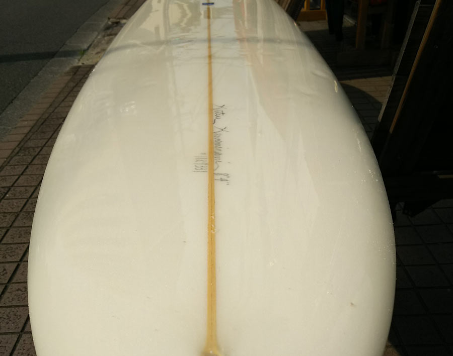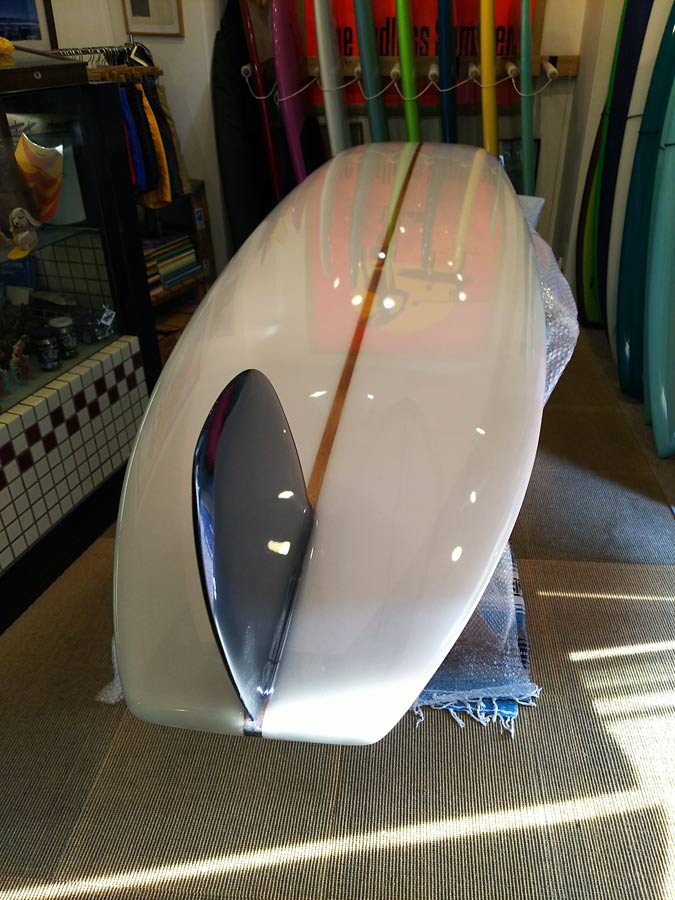 50/50レール ボトムはゆるめのロールにしてもらってDフィンをグラスオン レングスは、8’6”の少し短めのPIGです。
