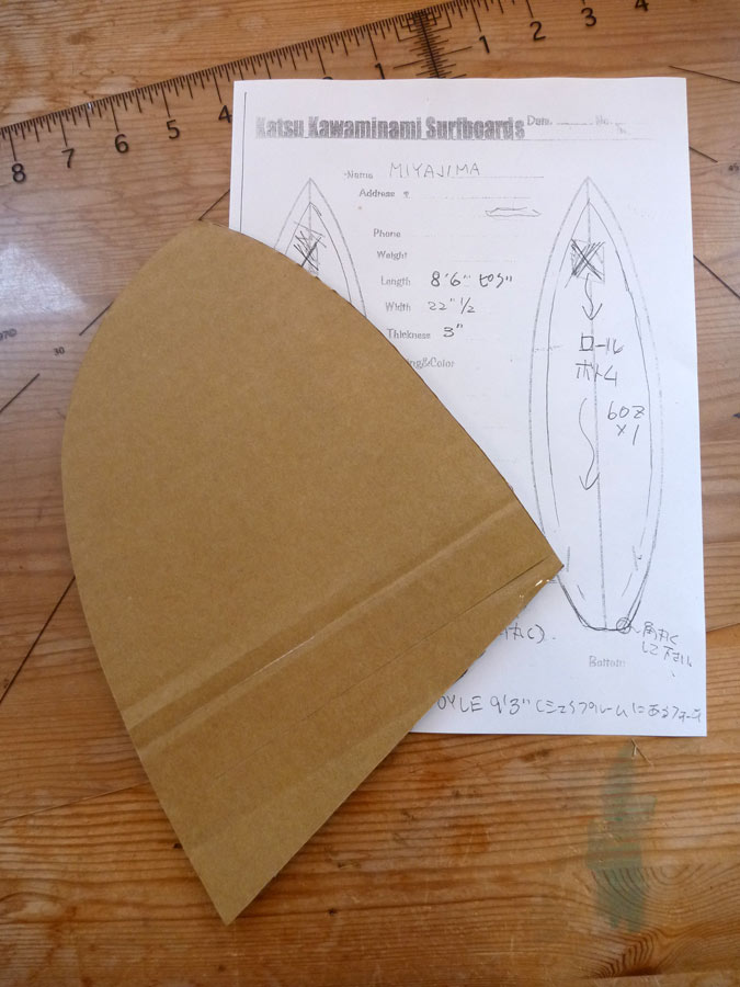 フィンは9.6より少しだけ小さくしたテンプレットを作りました。カラーリングのイメージも出来上がっているのですが、活さん曰く「ロングボードサイズ(9フィートくらい)のプリモもいいよ~」とのお言葉に迷っております。