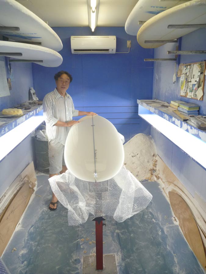 それから活さんのシェイプルームへ。やっぱりPRIMO。7’3”のニューシェイプはライダーのテストボードです。