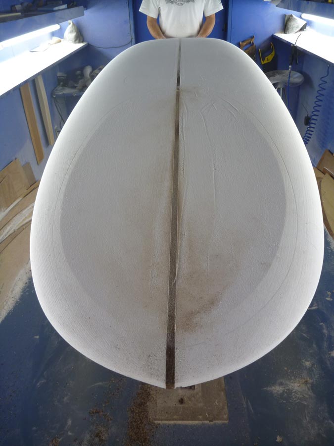 ノーズライドにより適しているロッカーのブランクスを使います。テールキックが得意げです 笑。