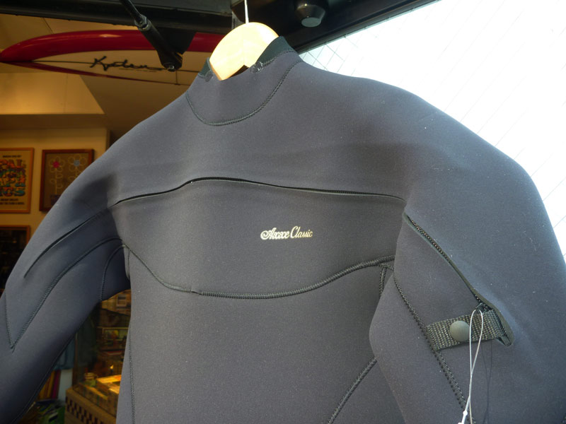 オーダーいただいたウェットがいろいろと出来上がってきております。これは、AXXE CLASSICのロングチェストジップ。冬用と違って、首回りはこんな軽い感じになります(海水温が低い地域の方には、二重ネックの用意があります)