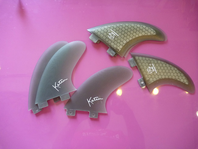 これらのフィンはニーボードで使っているものですが、全体的にボリュームがある活さんのフィンは、ダウンザラインのスピード重視です。カーブするときのホールド感がしっかりしていて、気持ちいいカービングができるので気に入っています。