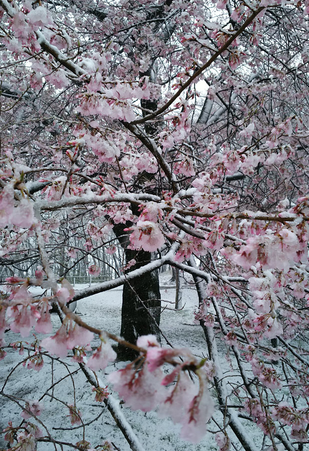 菜種梅雨なんて言っていたら、なごり雪。自宅のまわりはしっかり積もっています。2~3日前から開き始めた裏山のエドヒガンも雪で大変そうです。