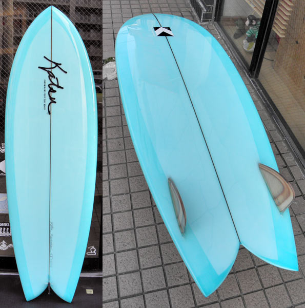 このフィッシュはオーダーですが、来週あたり店頭用のフィッシュが一本出来上がります。カラーは同じ感じの薄いブルーにダークウッドのストリンガー。ロゴなしの無地です。