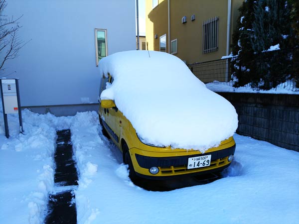 玄関を出たとたんに滑りました。危うくボードをぶつけるところでしたが、道路は平気。事前に路面の状況はきっちりとリサーチいたしました。