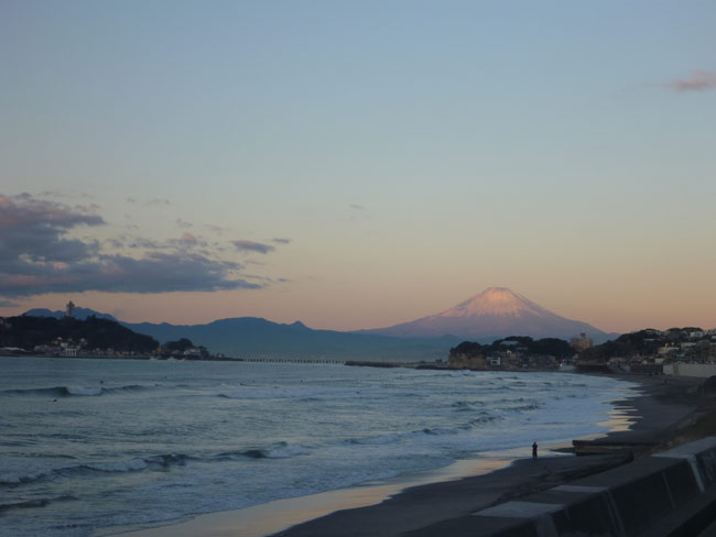 お日さまはようやく顔を出したばかりで、なかなか気温があがりません。すっかり冬の景色です。江の島と朝日に照らされた富士山。見慣れた景色ですが、落ち着いて見たのは久しぶりです。