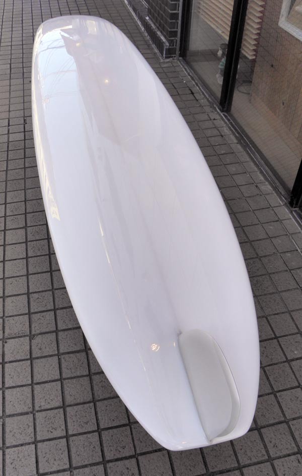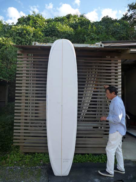 思いつきでしたが、いい感じじゃないでしょうか。もう少しテールをしぼっても良いかもしれません。でも、いつも入るリーフのポイントの波にはこのくらいがいいようにも思います。実際のボードの長さは9.8か9.9で、想定する波のサイズはヒザ~ムネくらい。重量があって、コンケーブのボトムでスルスル滑るイメージです。