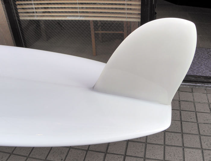 フィンは今回もグラスオンです。フィンの形はおなじDフィンでも前回のブルーのログのフィンよりも立ち気味で、テールの一番端まで下げてオンしてもらいました。