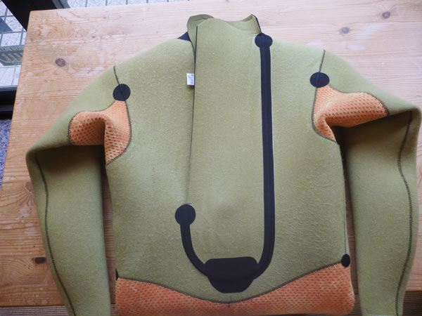オリーブ色の起毛は表は以前ご紹介したスキンのDRY MAXオリーブで、オレンジ色の部分はシェルターというジャージ表です。詳しくは以前のプログをご覧ください「ニューマテリアル 2017年9月29日 」