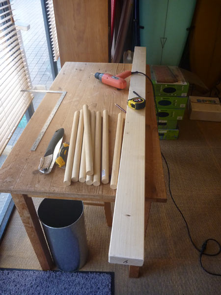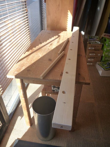 用意したのは、6フィートの2x4材が一本と丸棒。この丸棒を2x4材に取り付けます。