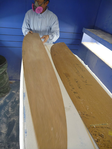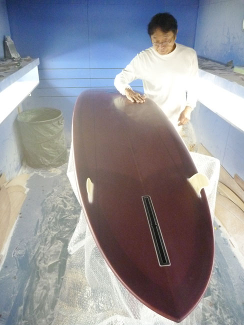 TIKIはサイドフィンがついたモデルです。サイドフィンはプライウッドを削り出したフィンをグラスオンしました。