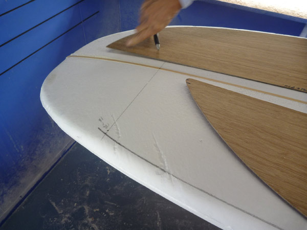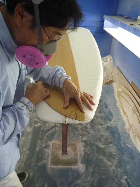 そして、アタマの中はやっぱりサーフボードのことばかりなんですが、アタマの中ばかりでは限界があるもの。活さんのシェイプルームで、置いてあるテンプレットをながめながら、これはどうかなあとアタマをひねっていたら、活さんが試しにアウトラインを引いてくれました。