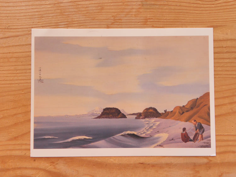 江の島と小動岬、岬のたもとには漁師の集落か家が数軒描かれています。遠景には富士山と横に見えるのは金時山でしょうか。波も良さそうです 笑。
