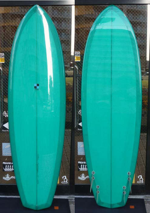 ターコイズグリーンのホットマンゴークアッド。ホットマンゴーは活さんが南の島の波で使っていたモデルなので、本当はもっとシャープなのですが、おっさん用(わたし)にファンなアウトラインに作っていただきました。