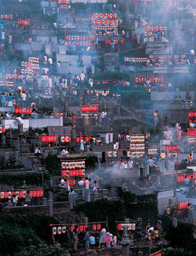 墓には提灯が立てられ、爆竹や花火でにぎやかになるのが長崎のお盆です。