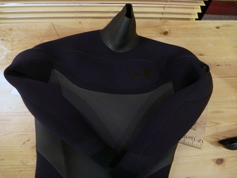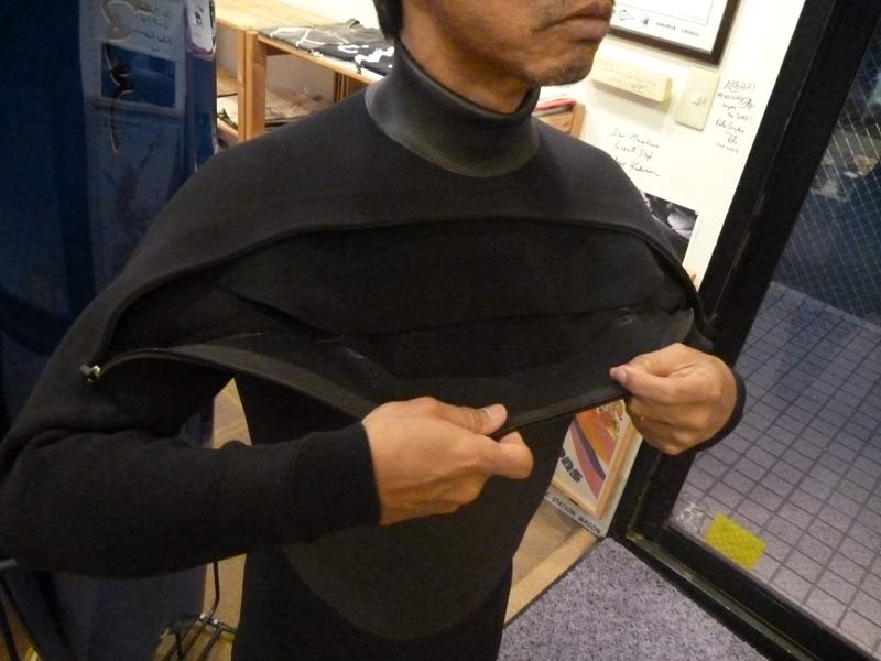 画像では見えませんが、胸の真ん中、ジャージとスキンの合わせ目の部分に指が一本とおるくらいの水抜きがあります。胸のジッパーは防水ではありません。浸水はあますが、内部の生地でウェット内部に入るのを防いで、水抜きからスーツの外へ排出されるしくみです。