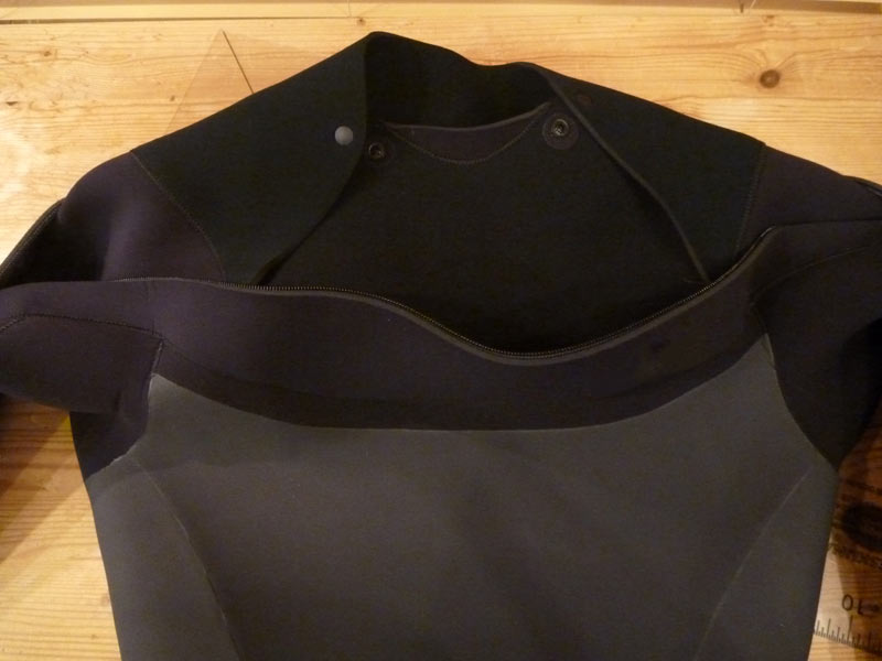 違いは、首から出入りする必要が無いので、腕回り、胸回りがネックインよりもタイト気味になっているところ。それからネックのパーツが防水のためラバーになっている点です。