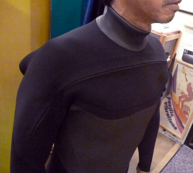 見た目がドライスーツっぽいかもしれませんが、胸と腕まわりのフィット感は通常のバックジップタイプのウェットよりも若干緩めでパドルの動きは楽ですが、だらしなく見えてしまうようなだぶつきはありません。