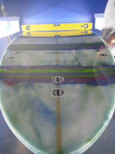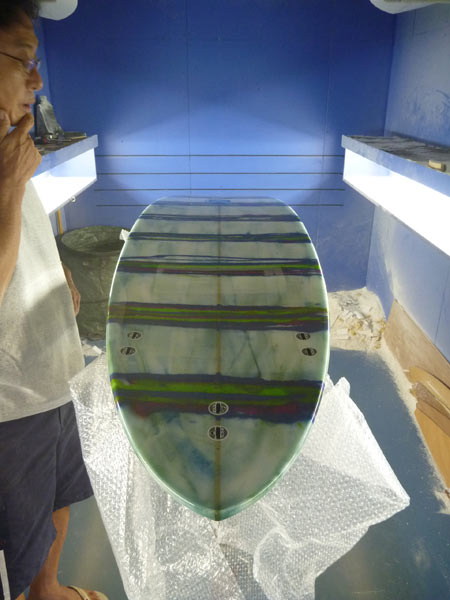こちらはラミネート中。BONITAフィッシュ。赤のティントが雰囲気です。ダークウッドのストリンガーを使い、ノーズにはフィッシュマークを入れました。