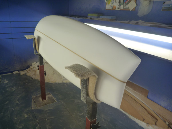 濃い色のストリンガーが一本、ボードの真ん中のアクセントになります。バスウッド(通常使っている白っぽいウッドのストリンガーです)はバスウッドで、ラミネートのカラーで違う雰囲気に見えたり、白っぽく仕上げるのも好きだったりと、サーフボードのディテールのひとつになる部分です。