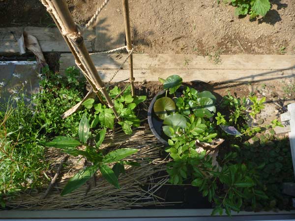 睡蓮と水草で日陰を作ってあげてメダカも元気です。
